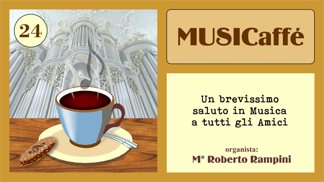 MUSICaffè’ è un appuntamento video settimanale sul mio Canale YouTube 'Roberto Rampini' nel quale ogni Venerdì (dal 17 Novembre 2021 fino al 22 Aprile 2022) ho proposto un breve brano musicale d’Autore da me eseguito all’organo (originale o trascritto per questo strumento) facente parte di una nuova serie di 24 filmati: una sorta di piacevole ‘saluto in Musica’ rivolto a tutti gli Amici! A conclusione di questa seconda serie ho raccolto i 24 audio dei filmati (che resteranno comunque visibili anche in seguito) in un CD Audio che propone 80 minuti complessivi di buona Musica! Se qualcuno desiderasse ricevere una copia del CD può contattarmi scrivendo a: robertorampini57@gmail.com