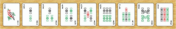 Sono complessivamente 108 e si chiamano numerali poiché riportano, per l'appunto, dei valori numerici. Si suddividono in tre semi: Bambù, Caratteri e Cerchi.