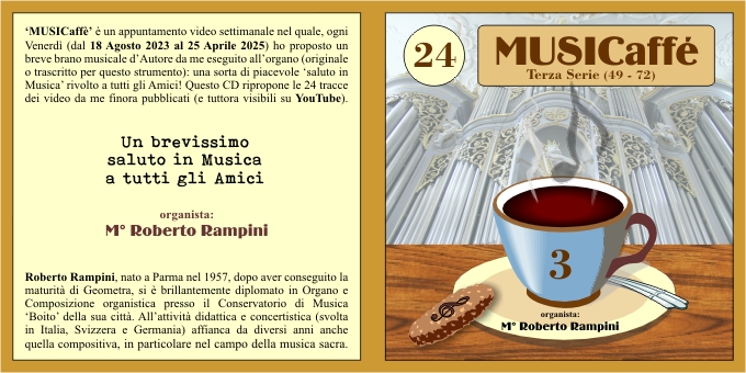 MUSICaffè’ è un appuntamento video settimanale sul mio Canale YouTube 'Roberto Rampini' nel quale ogni Venerdì (dal 18 Agosto 2023 fino al 25 Aprile 2025) ho proposto un breve brano musicale d’Autore da me eseguito all’organo (originale o trascritto per questo strumento) facente parte di una nuova serie di 24 nuovi video: una sorta di piacevole ‘saluto in Musica’ rivolto a tutti gli Amici! A conclusione di questa terza serie ho raccolto i 24 audio dei filmati (che resteranno comunque visibili anche in seguito) in un CD Audio che propone 80 minuti complessivi di buona Musica! Se qualcuno desiderasse ricevere una copia del CD può contattarmi scrivendo a: robertorampini57@gmail.com